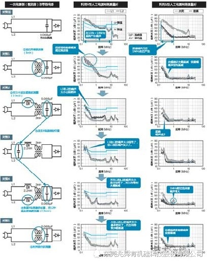 传导噪声的对策分三种情况实施:①差模噪声较大、共模噪声较小时;②共模噪声较大、差模噪声较小时;③两种噪声都比较大时。